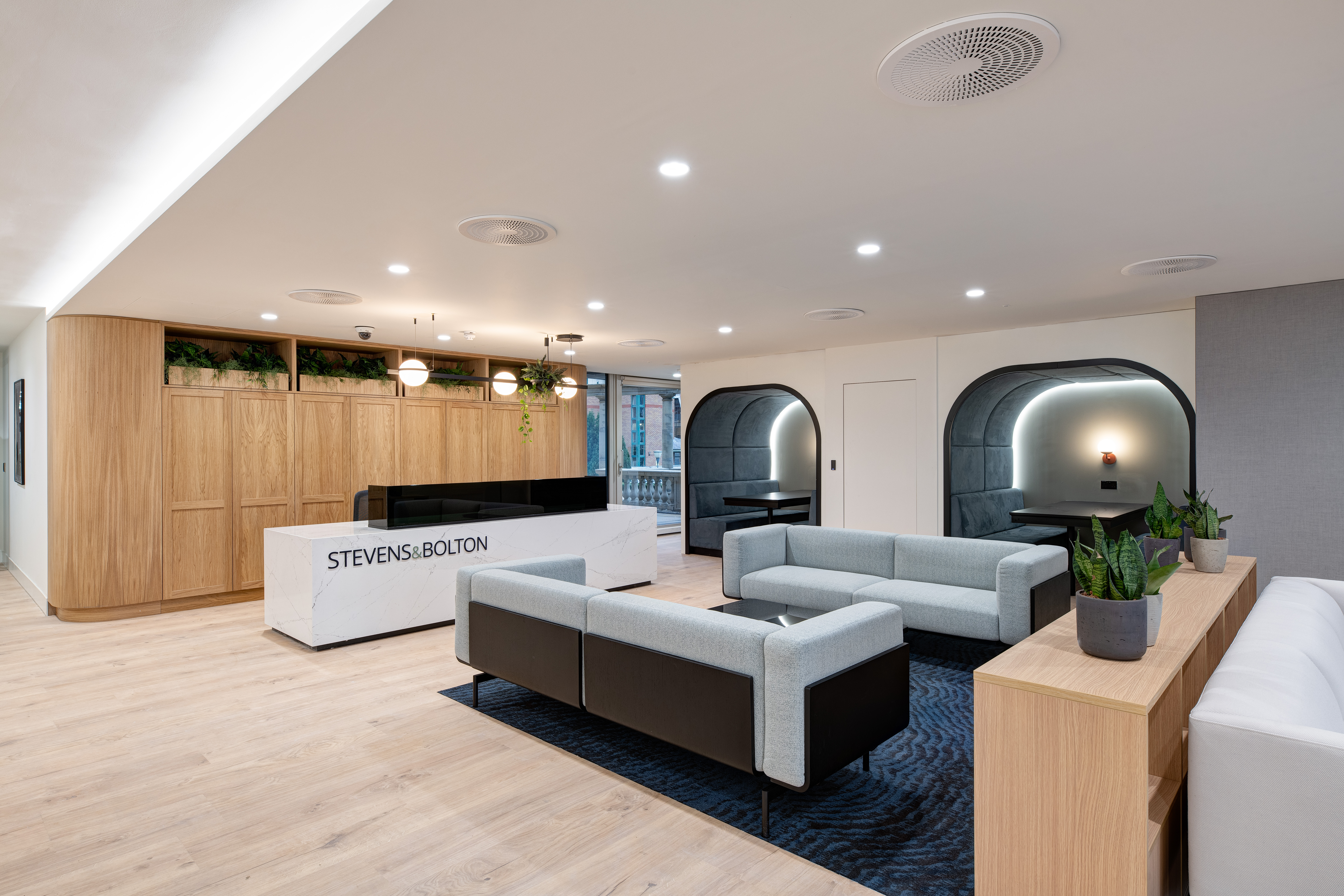 Legal firm, Stevens & Bolton LLP were seeking a new office space to accommodate new ways of working whilst fostering a return to the office post-pandemic. DENTON collaborated with Stevens & Bolton LLP to develop a change management strategy, downsizing the office space and transitioning from assigned desks to agile workspaces. The design incorporated private and open-plan areas, meeting spaces, and a client meeting suite, inspired by the office’s picturesque surroundings. Sustainability and well-being were prioritised, with environmentally friendly materials and practises integrated into the design.