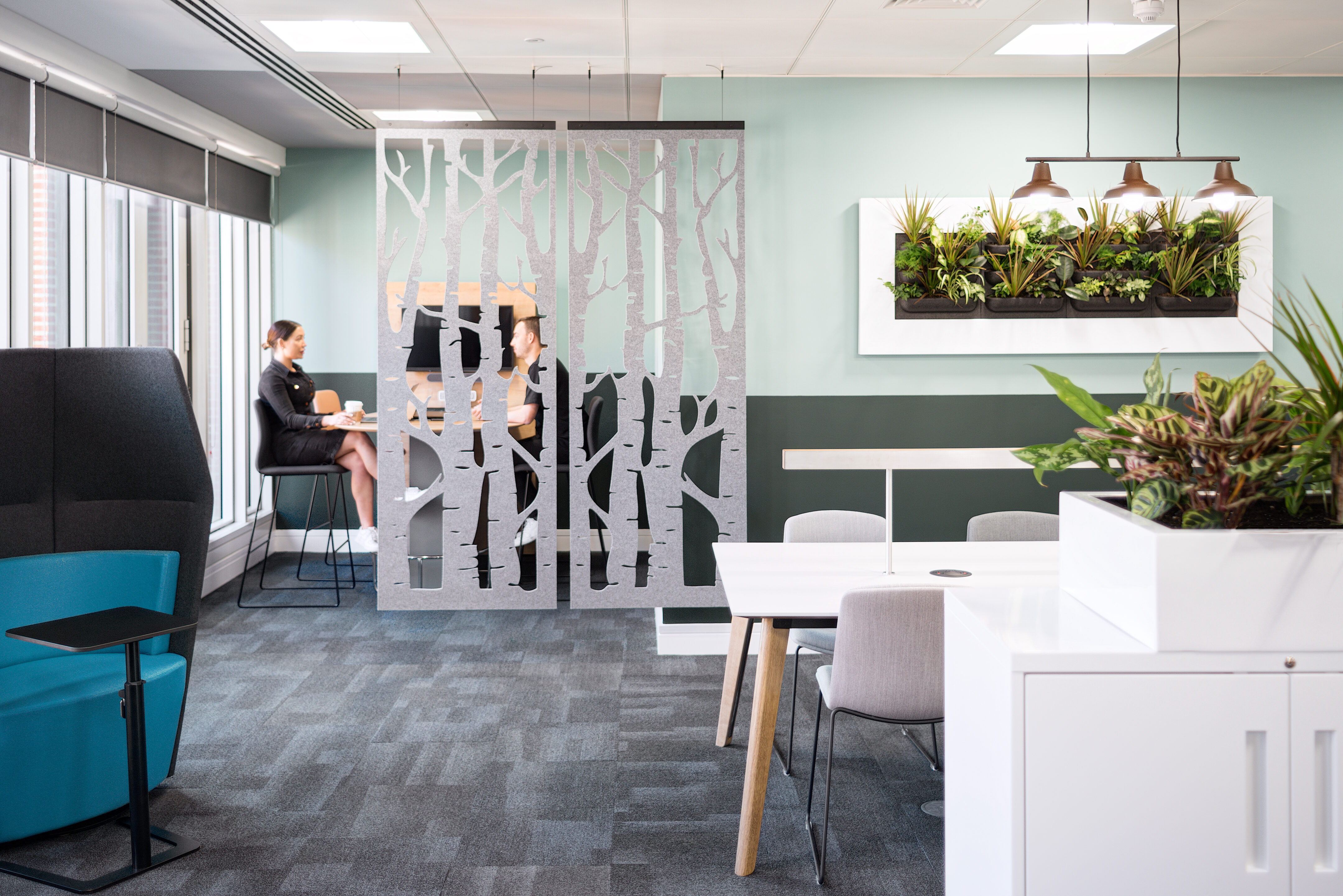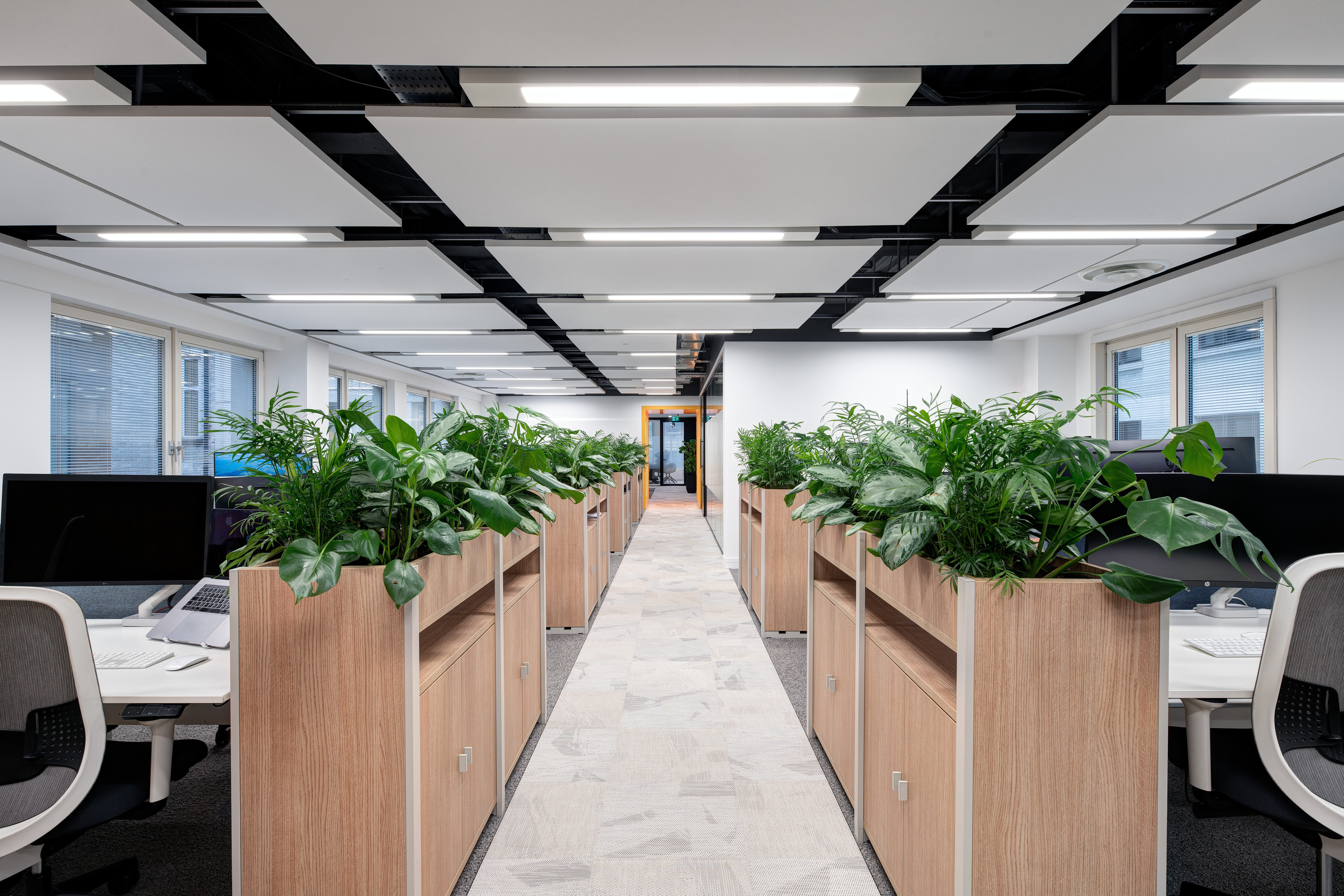 Incorporating plants into the office environment not only adds visual appeal but also serves as a natural sound absorber. Certain types of plants, such as broad-leaved varieties like peace lilies, rubber plants, and snake plants, are particularly effective at absorbing high-frequency noise. Large living walls or potted plants strategically placed throughout the office can help dampen sound reflections and create a calmer, more tranquil atmosphere conducive to focused work. For more information, check out our article discussing the benefits of biophilic design.